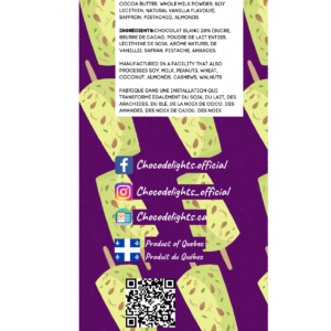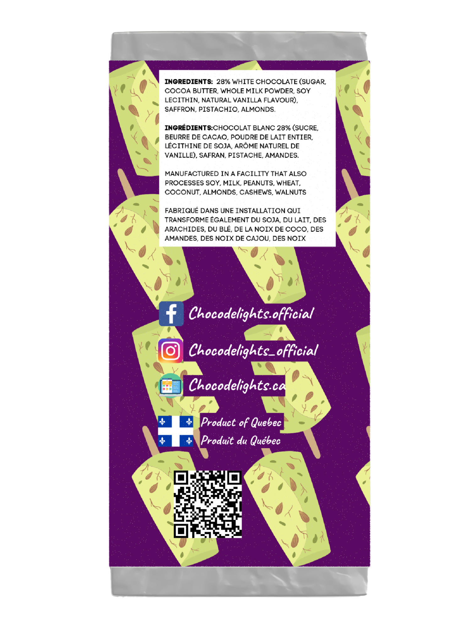 INGRÉDIENTS: CHOCOLAT BLANC 28% (SUCRE, BEURRE DE CACAO, POUDRE DE LAIT ENTIER, LÉCITHINE DE SOJA, ARÔME NATUREL DE VANILLE), Safran, pistache, Amandes.